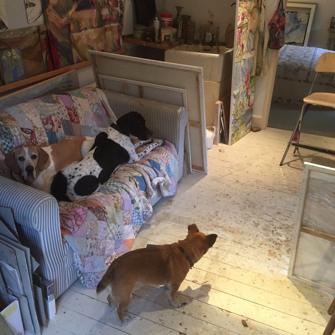 Coffee, Classic FM, Radio 4 and my three dogs lying on the studio sofa along with lots of drawings, photographs and cuttings to inspire me. I like to look and learn from a large collection of art books that are scattered about – Rose Hilton, Keith Vaughan, Ben Nicholson, Ivon Hitchens, Richard Diebenkorn and Joan Eardley have all taught me so much about colour combinations and palette choices.